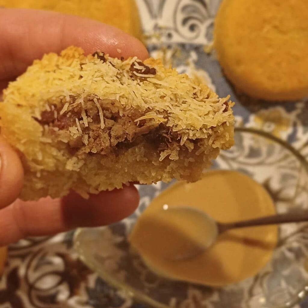 J’ai trouvé, sur le site d’un blogueur culinaire israélien d’origine marocaine, une recette originale à base de kadaïfs. On crée une sorte de gâteau de kadaïfs farci d’un hachis de bœuf que l’on aura au préalable fait revenir à la poêle avec des dattes ou des abricots secs, ou encore des figues séchées, des pignons de pin ou des pistaches, des noix concassées, et, comme épices, de la cannelle, de la noix de muscade et du sirop de datte (silan en hébreu). Ces gâteaux de kadaïfs seront ensuite cuits dans de petits moules à muffins et, une fois sortis du four, dorés et croustillants à souhait ! On les trempera ensuite dans de la tehina, une crème à base de pâte de sésame.