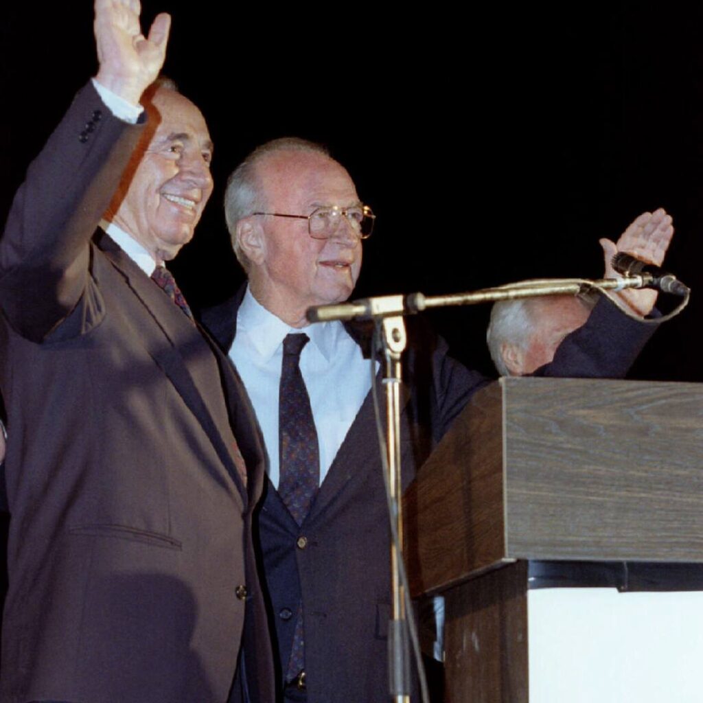 “Permettez-moi de dire que je suis moi aussi enthousiaste. Je tiens à remercier chacun d’entre vous qui êtes venus ici pour dénoncer la violence et défendre la paix. Le gouvernement que j’ai l’honneur de diriger, avec mon ami Shimon Peres, a décidé de donner une chance à la paix. Une paix qui résoudra la plupart des problèmes de l’État d’Israël.