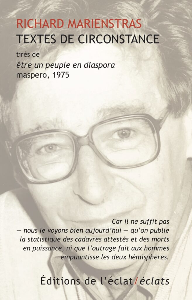 Lorsque nous lisions, à sa parution en 1975, Être un peuple en diaspora (Éditions Maspero), et que nous avions traversé la « révolution » de Mai 68 à Paris ; lorsque le Bund, le trotskisme, l’attente du Grand Soir ne nous rebutaient pas, nous tombions volontiers d’accord pour adhérer aux thèses de Richard Marienstras, l’intellectuel juif de gauche par excellence, éminent spécialiste de Shakespeare. En gros : les Juifs formaient un peuple dont la vocation était de vivre — et de continuer de vivre — en diaspora. Antireligieux, antisioniste, antiléniniste.