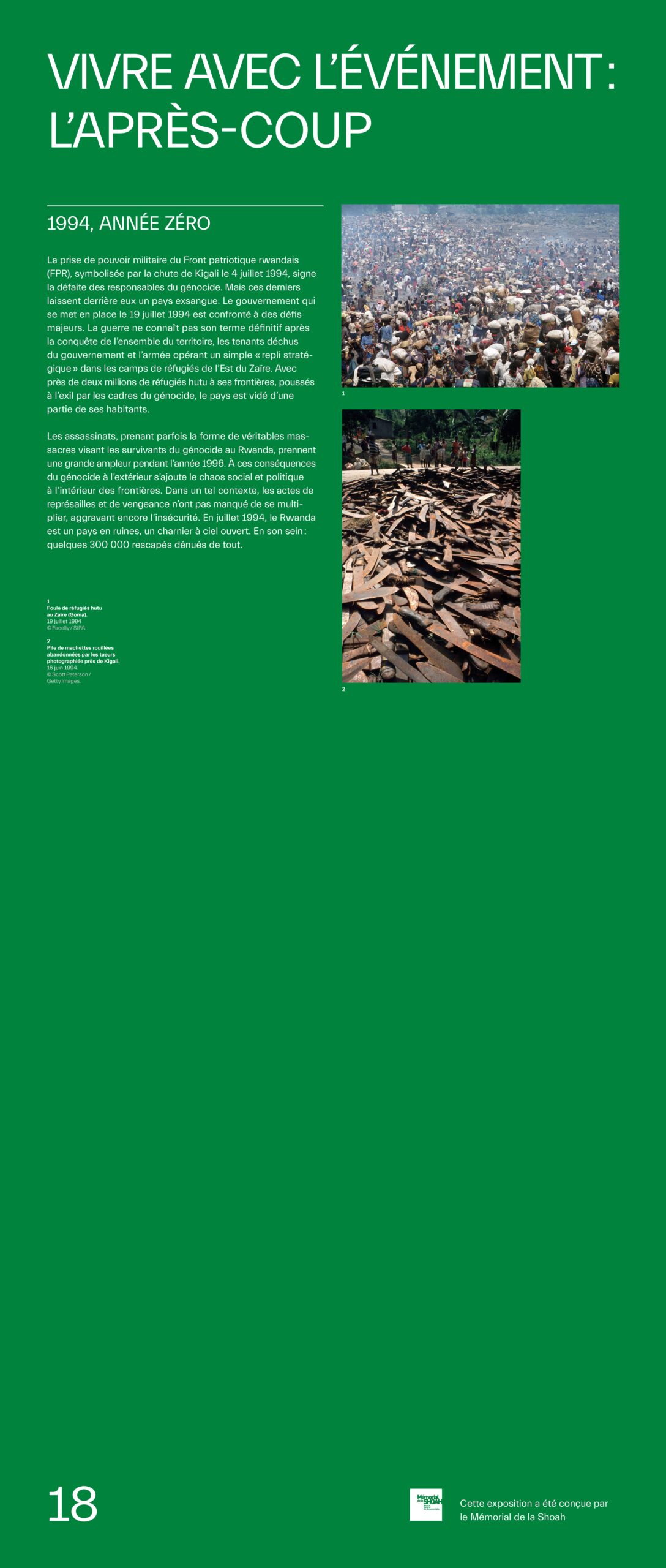 Créée lors de la 25e commémoration du génocide des Tutsi au Rwanda, l’exposition retrace l’histoire du dernier génocide du XXe siècle avec en fil rouge une question : comment un crime d’une telle ampleur a-t-il été possible ?